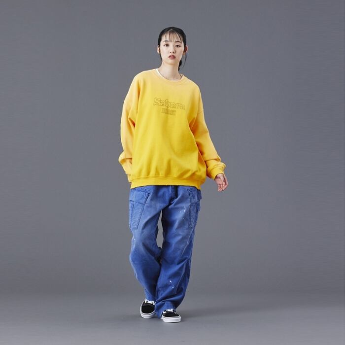 Liberaidersよりヴィンテージ感のあるフェード加工が特徴の8.0oz裏起毛を使用したクルーネックが入荷。リブ先にグラインダー加工も入れ、本格的なヴィンテージ感のある仕上がりとなっています。胸には手書きのSaharaのプリント、背面は今季を代表するキャメルロゴプリントが入ります。淡いカラー展開が特徴で、重くなりがちなな秋冬のコーデのインナーとしてもお勧めな一着。是非。