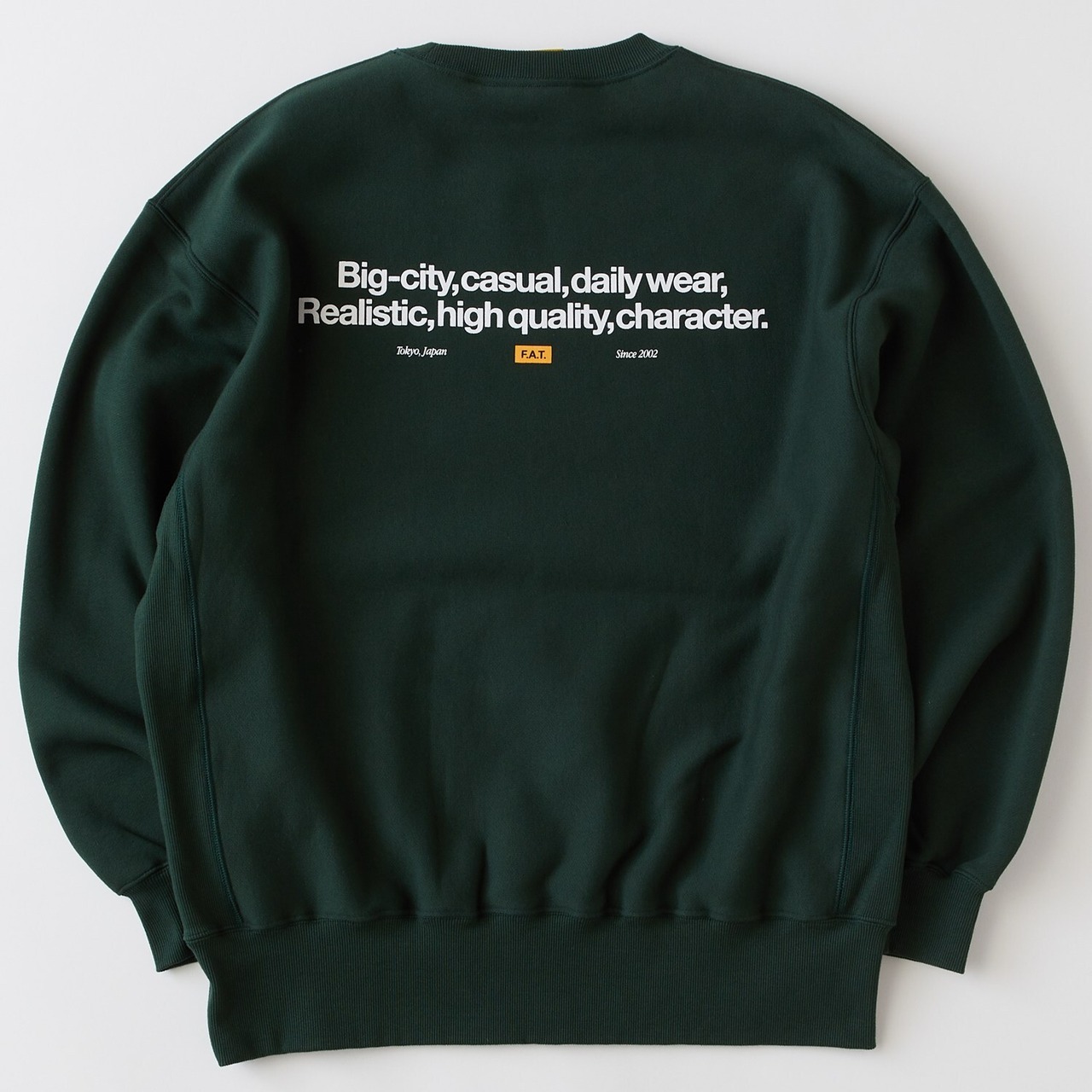 F.A.T.よりシンプルな胸ロゴ刺繍とバックプリントが印象的なスウェットシャツが入荷。オリジナルで編み立てたT/C裏毛起毛素材は、程よい肉感で着心地の良さが特徴的です。アメリカンオーセンティックを感じさせる縫製、生地方向やサイドパネルなど細部にまでこだわったアイテム。あらゆるコーディネートに欠かせないオールマイティーな1枚。裾のブランドネームも程よいアクセントになっています。是非お試しくださいませ。
