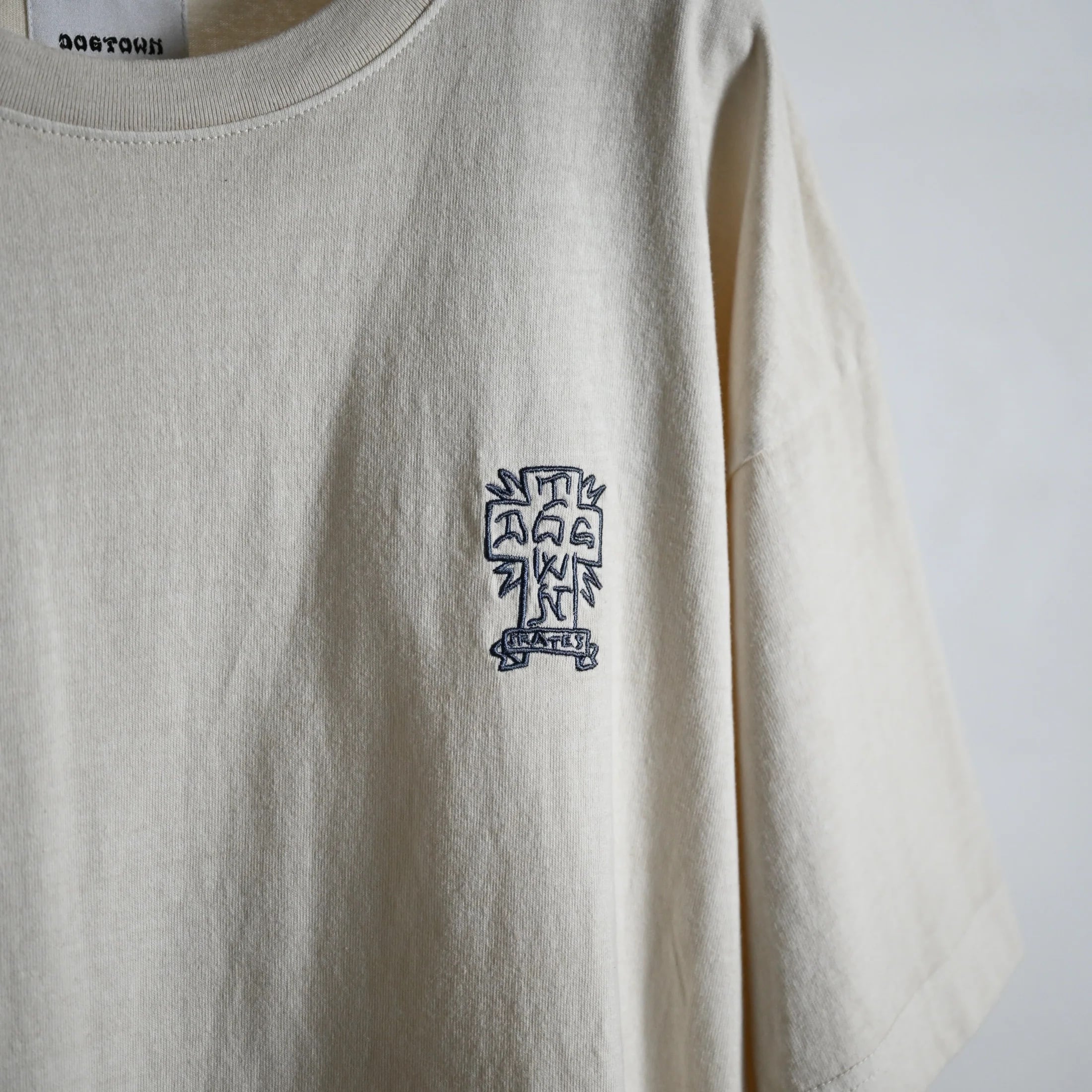 DOG TOWNよりフロント左胸にGONZデザインクロスとバックにもGONZデザインのグラブトリックアートが入ったTシャツがリリース。全体的にややゆったりとしたシルエットで、バランス的に丈は少し短めのBOX型です。是非。