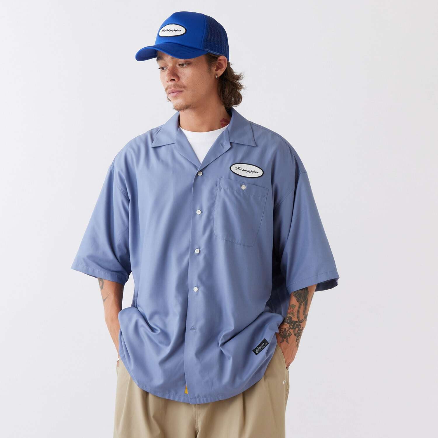 F.A.T.より肌触りが良く独特なドレープ感のあるスパンクロスを使用した、通常よりも身幅・肩幅にゆとりをもたせたBIGシルエット半袖シャツがリリース。胸ポケット上のロゴ刺繍ワッペンがアクセントとなり、絶妙なワークスタイルを演出してくれるアイテム。裾のブランドネームもさり気なく主張してくれます。是非。